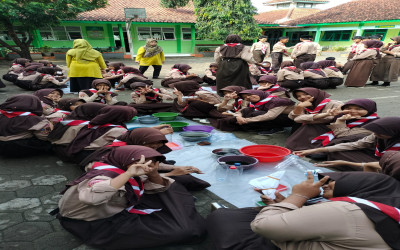 Suasana kebersamaan siswa saat praktik pembuatan batik jumputan di halaman madrasah